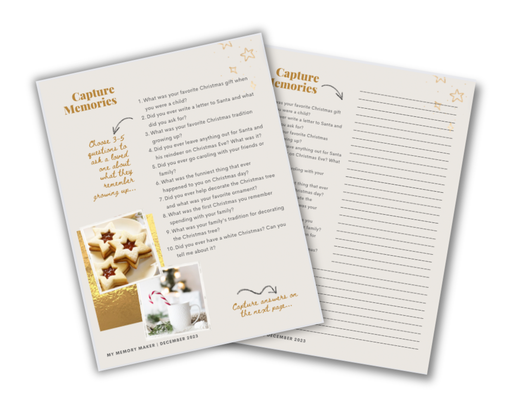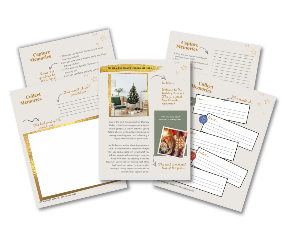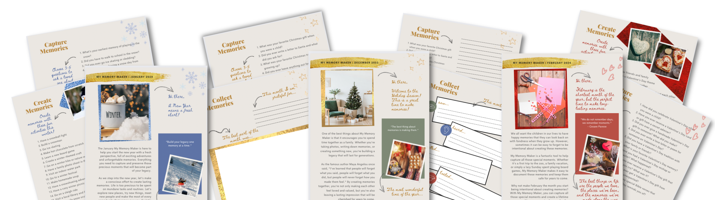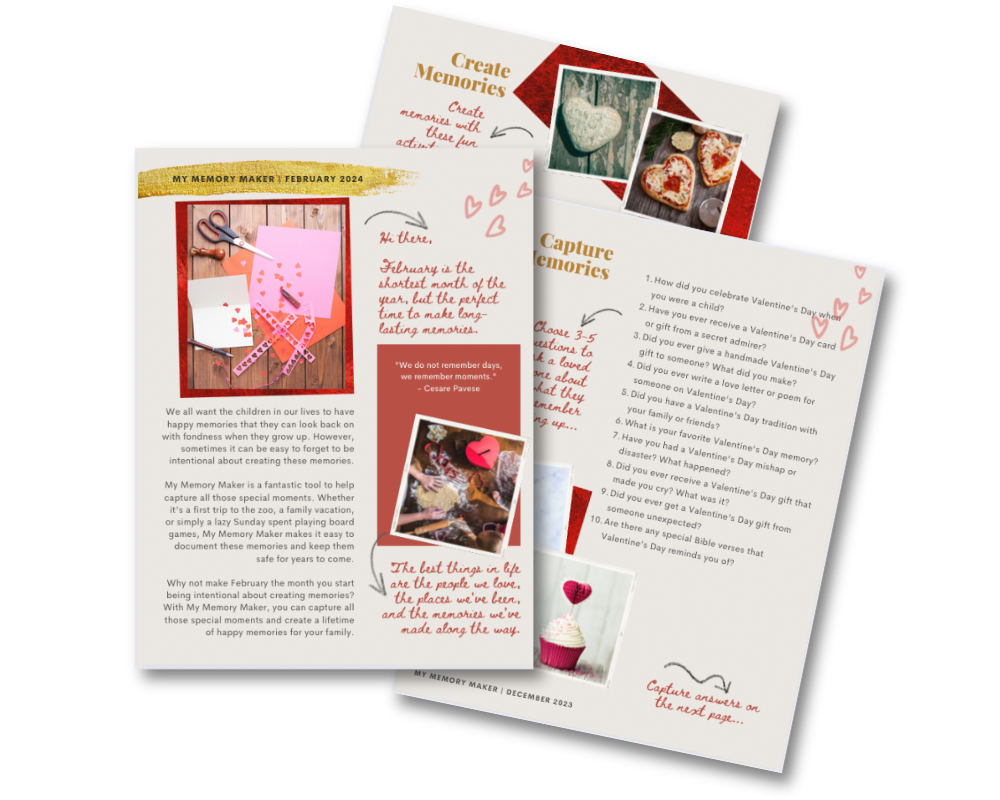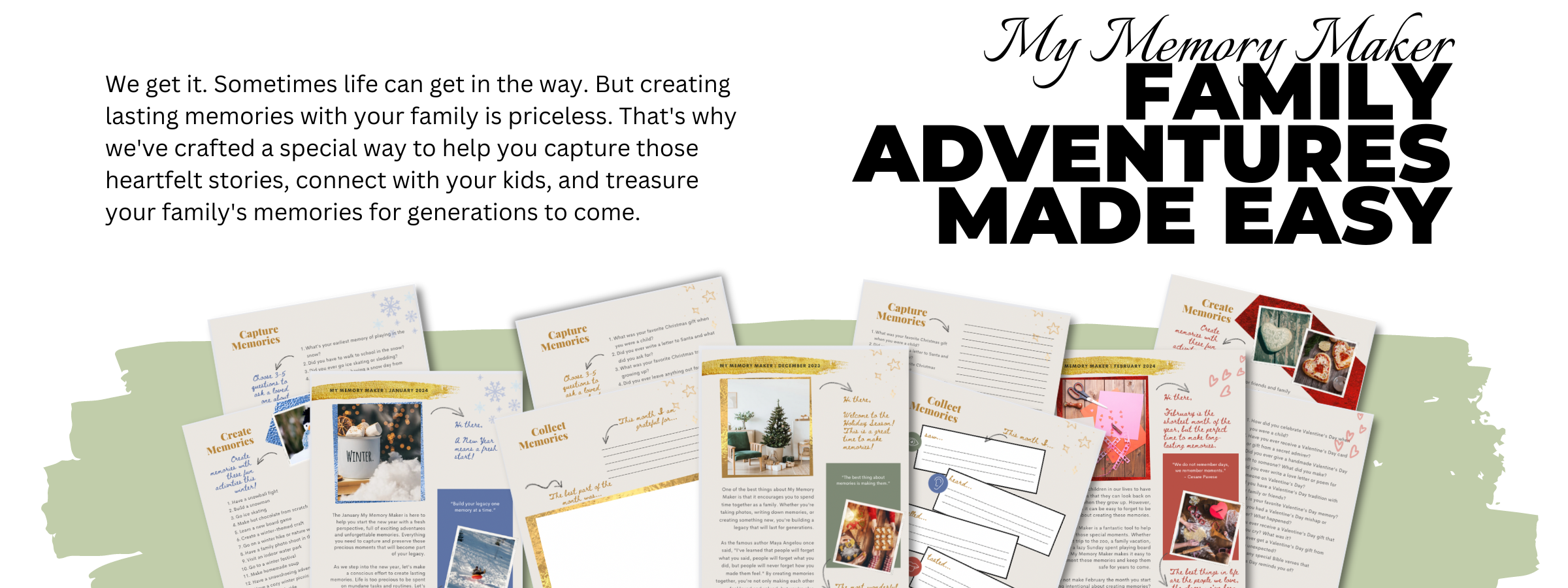 New My Memory Maker Download Every Month! Each month you will receive 8 pages of prompts, questions and activities to choose from so you can start building your family memories right away!